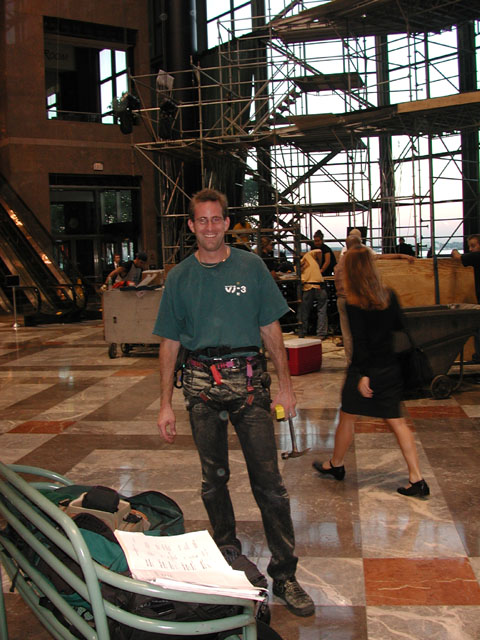 11 November 2001 As many of you know, the company I frequently freelance for was doing a job, Quebec New York | Crush the Castle, at the World Financial Center Winter Garden Atrium. Our work began on Saturday, Septermber 8th, with a crew of more than 30, with day and night shifts. The opening day was to be Friday, September 14th, with events throughout the city for the next month. I had been working the night shifts, and I left at 7:00am that morning planning to return at 8:00pm to walk the truss for focus. That morning, a crew was arriving to hang the lights on the stage we assembled. Obviously everything changed. |